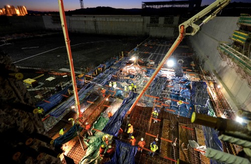 A 17 metre deep excavation pit to hold the tokamak construction and acting as an earthquake isolation pad had been completed in June 2011. Concrete has been poured into water-scoured crevices in the platform floor.